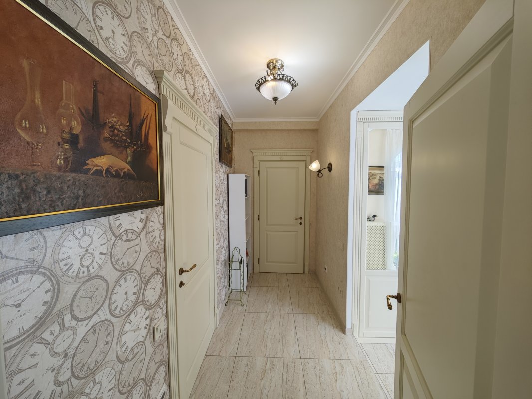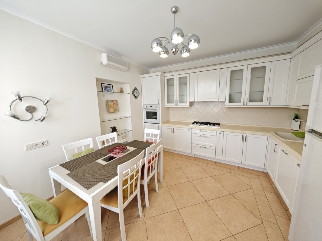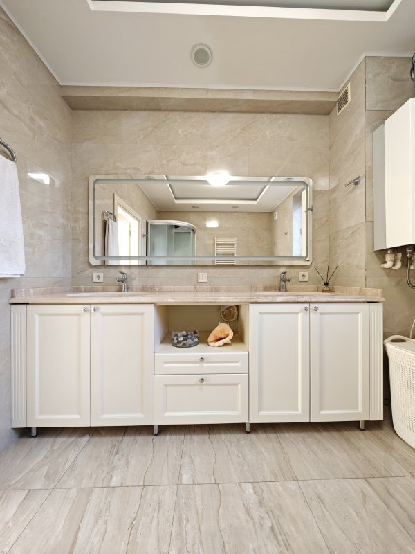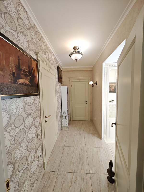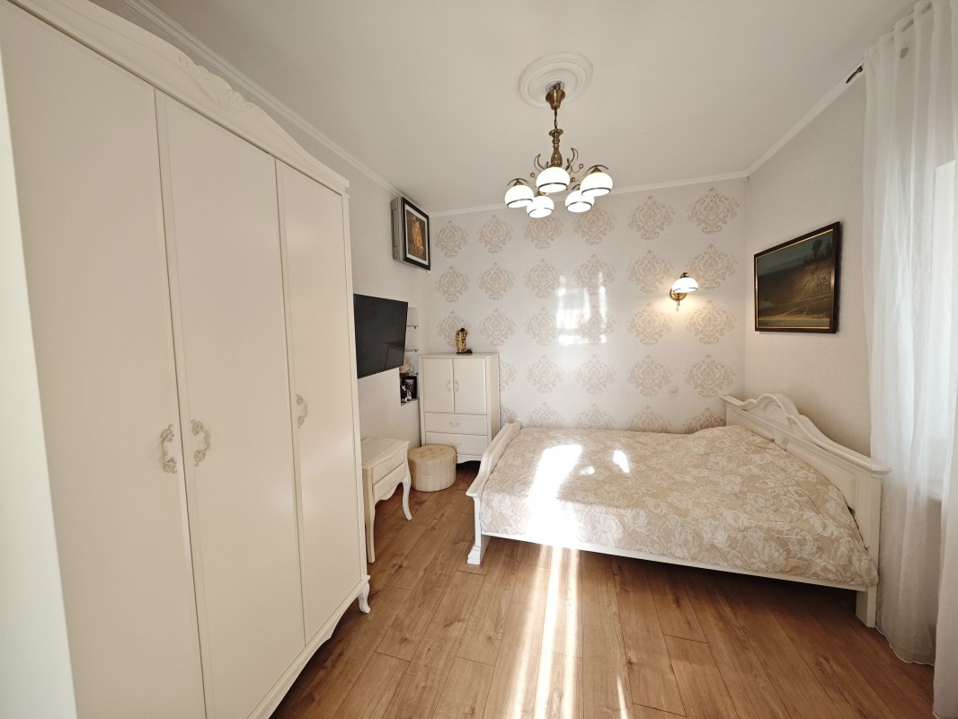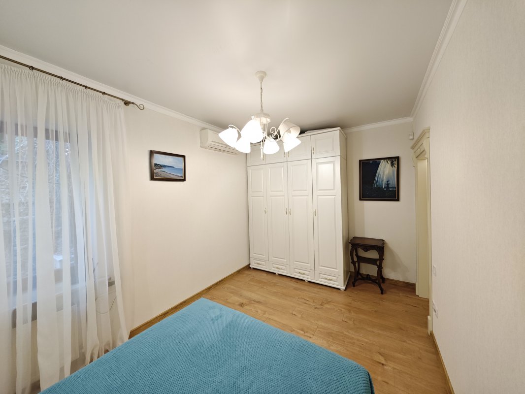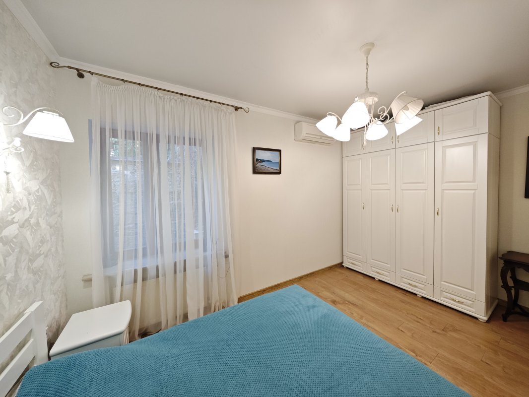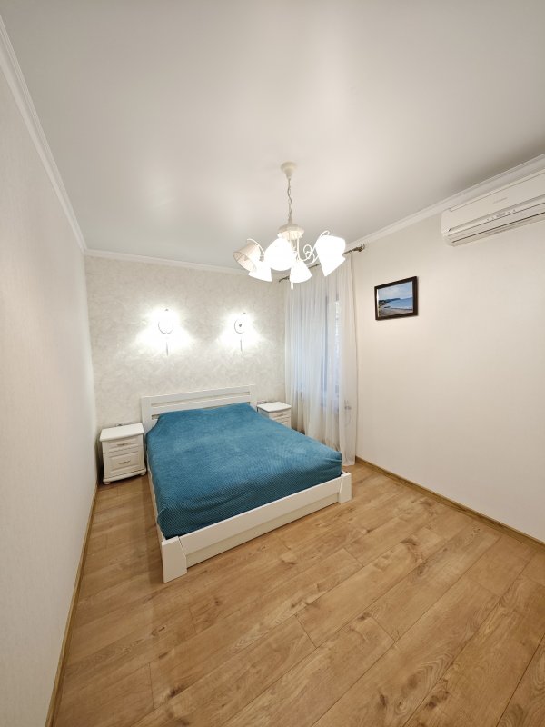 В доме 2 спальни с двуспальными кроватями и шкафами, кухня 16 м², красивый современный ремонт. Есть вся необходимая техника: посудомоечная машина, телевизор, интернет, сигнализация. В прихожей — вместительный шкаф.
