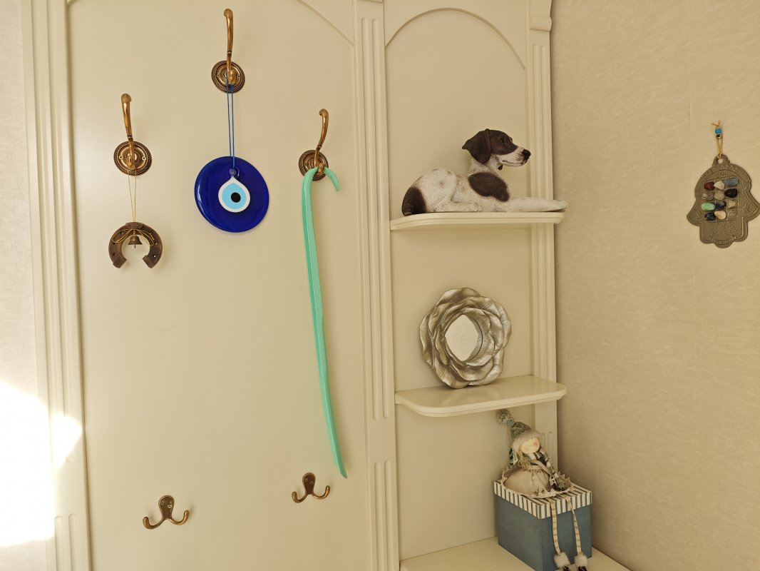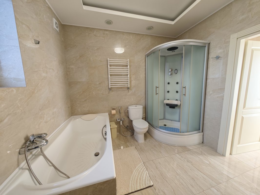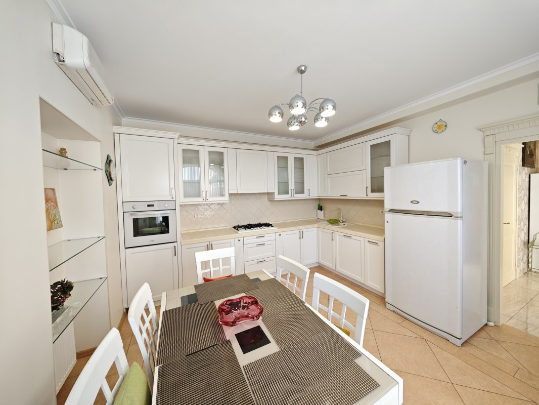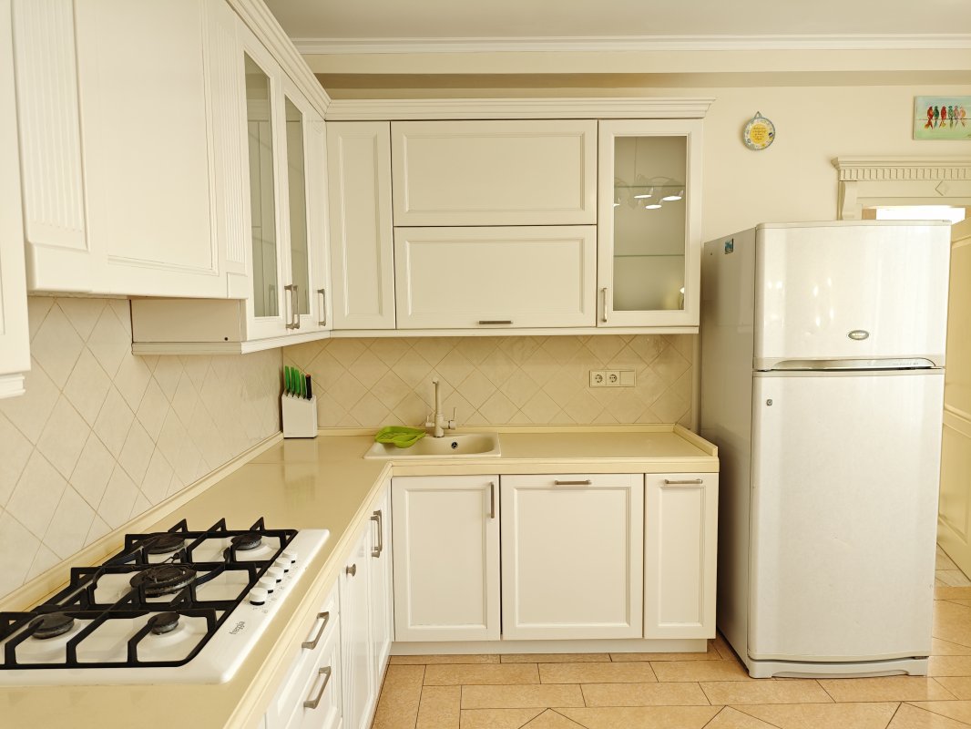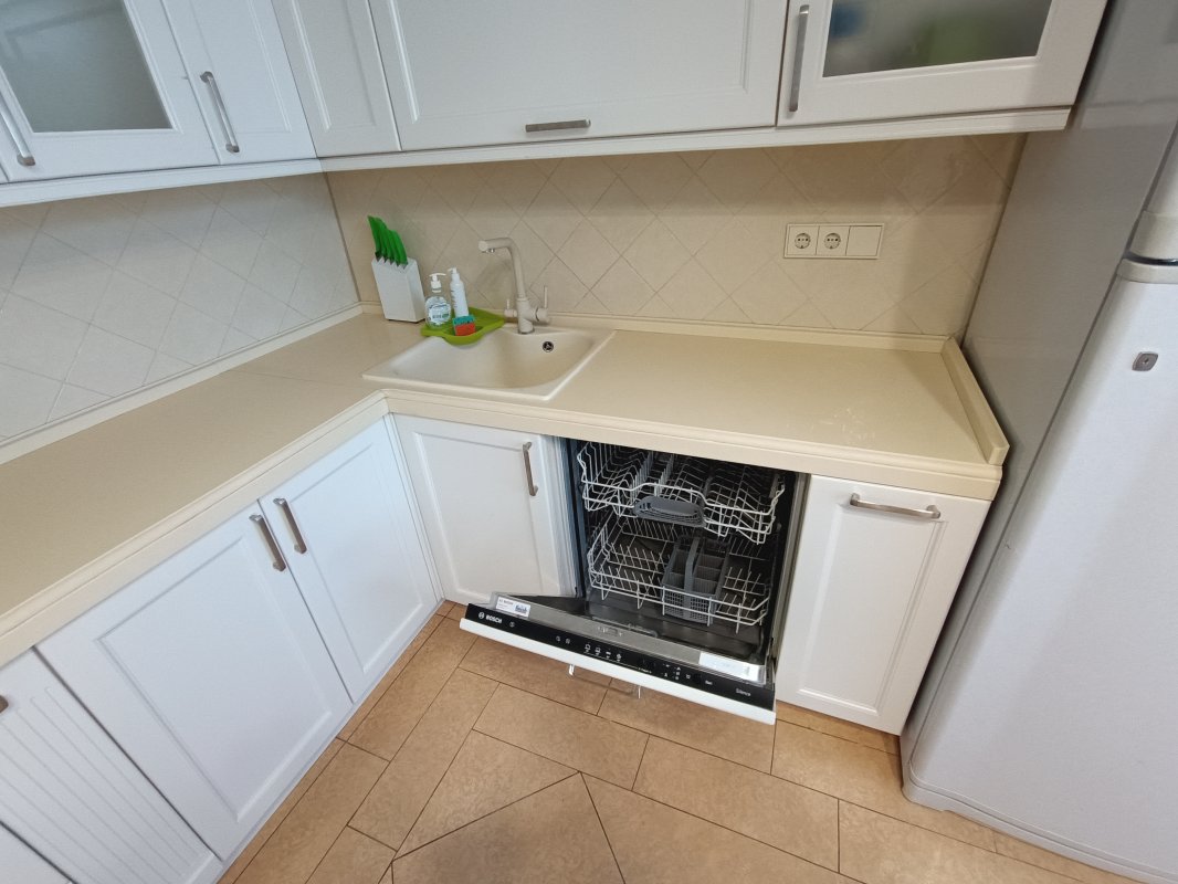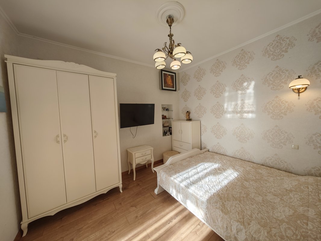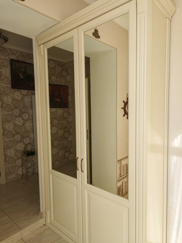 В доме 2 спальни с двуспальными кроватями и шкафами, кухня 16 м², красивый современный ремонт. Есть вся необходимая техника: посудомоечная машина, телевизор, интернет, сигнализация. В прихожей — вместительный шкаф.